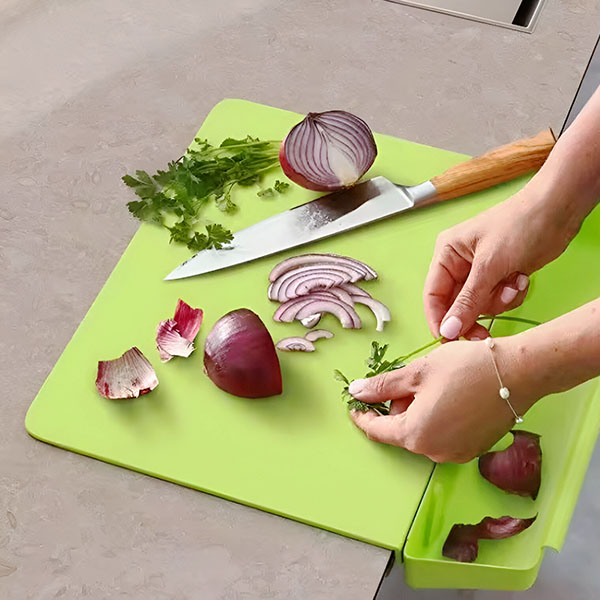 Uzturiet savu virtuvi sakoptu un efektīvu! 🍅🍴 Šī griešanas dēlīša noņemamais trauks uztver visas sasmalcinātās sastāvdaļas, padarot maltītes gatavošanu vieglāku un ietaupot laiku uzkopšanai. 🧽✨ Atvadieties no nekārtības uz darba virsmas!