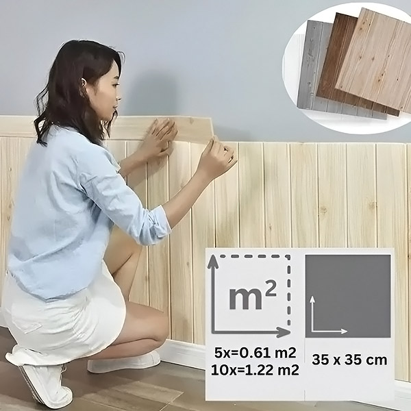 Katrā iepakojumā ir 5 gabali (35×35 cm), kas sedz 0,61 m². Pirms sākat darbu, aprēķiniet, cik iepakojumu jums būs nepieciešams, ņemot vērā jūsu sienas platību. Lielākām telpām iegādājieties vairāk iepakojumu un izmantojiet apjoma atlaides!