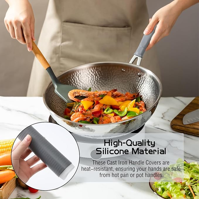 Mūsu silikona pārvalki ir izstrādāti tā, lai būtu saderīgi ar dažādu izmēru katlu un pannu rokturiem, padarot tos par universāliem un pielāgojamiem virtuves piederumiem, kas lieliski piemēroti čuguna pannām un pannām ar plakanu dibenu.
