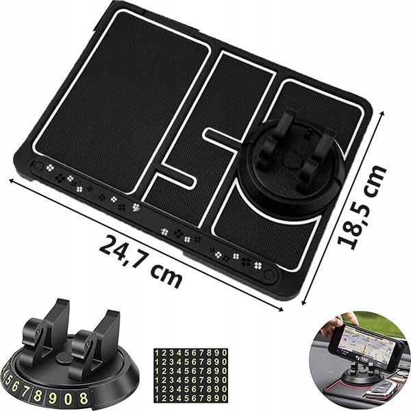 📏 Universāla saderība: Ar izmēriem 24,7 x 18,5 cm, šis paklājs nevainojami der jebkuram auto panelim, nodrošinot ciešu un drošu novietojumu.