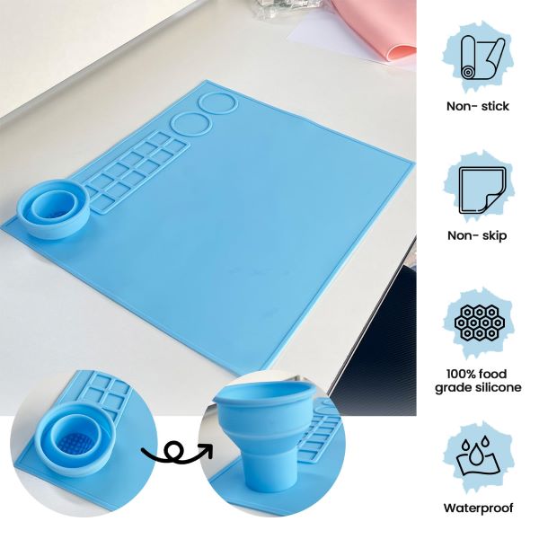 Izgatavots no 100% pārtikas kvalitātes silikona, šis ūdensnecaurlaidīgais, nepielipušais un neslīdošais paklājiņš ir ideāli piemērots visām jūsu amatniecības vajadzībām. Ar 14 iedobēm un sajaukšanas zonu tas ir lieliski piemērots jūsu piederumu organizēšanai.