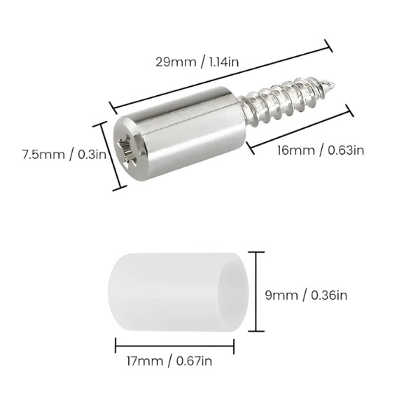 Izmēri: Skrūve: 24 x 7 x 12 mm, Silikona vāciņš: 15 x 9 mm